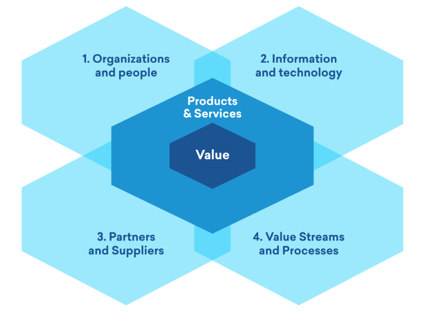 L’ITIL v4 définit ces quatre dimensions essentielles dans le processus de cocréation de valeur pour les clients et autres parties prenantes.